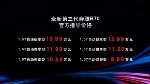 全新第三代奔腾B70共推出6款车型,售价区间为9.99-13.99万元,比预售价格低了一些,定价显得非常有诚意。