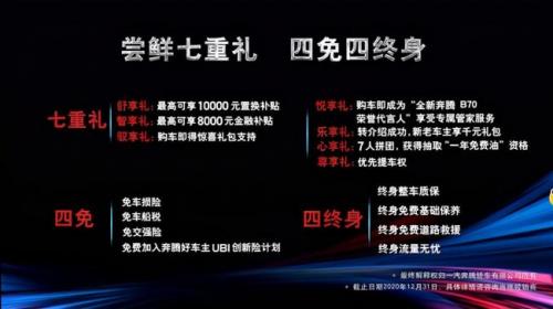 除了宣布价格外,一汽奔腾还公布了“尝鲜七重礼”和“四免四终身”的购车政策,对于喜欢第三代奔腾B70的消费者来说,抢鲜反而能享受到更多的实惠与权益。