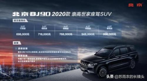 除此之外,北京BJ90 2020款用户还将享受专属一对一尊享服务,包括进店保养维修均按照国际豪华车标准执行,整车3年/10万公里质保。