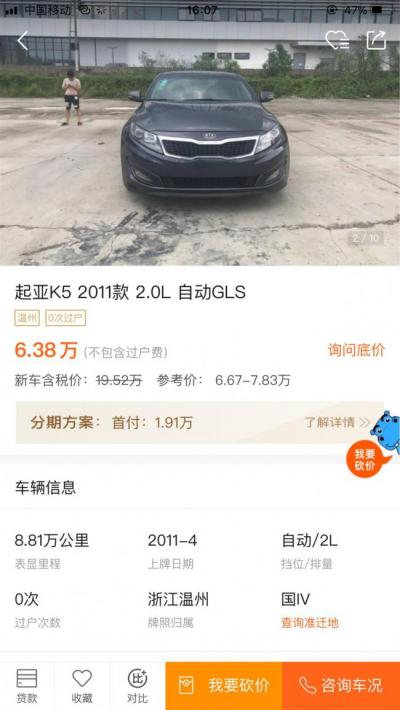 我最近就看上了同学手里的一台车,准备结婚的他购置了新车,家里面养两台车也确实是有一些负担,索性就把他原来的起亚K5出售,我平常就比较关注车,看到这个情况就顺口问了一句,他说我要的话6.38万就能够给我,接下来就给我仔细的介绍了一下他这台车的具体状况。他的这台起亚K5是2011款的2.0L自动GLS版,于2011年4月上牌,目前行驶了8万多公里,这样的价格看起来似乎还是比较低的,我在网上对这台车进行了一个估值,目前这台车的售价区间为6.67万元到7.83万元。这样看的话,同学给我的价格要比市场价稍微低一些,但是要比收车价高出一些,估计这也是他想要卖给我的一个原因。