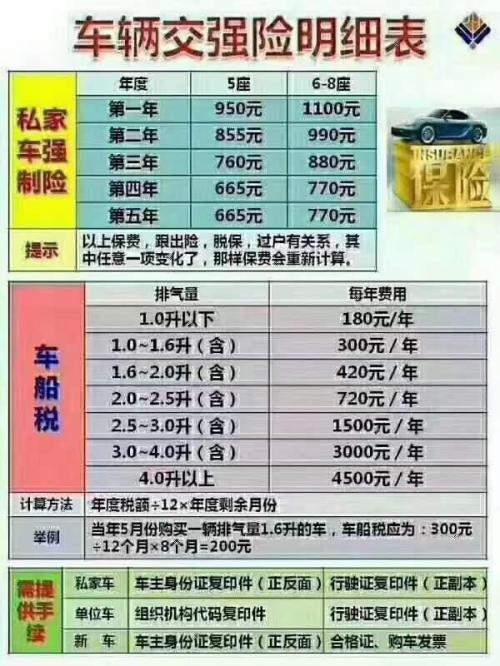通过图片大家可以清晰地看到新车每年的保费5座的是950 6-8座的是1100如果不发生过户、出险等行为是每年递减的,还有车船税,出了一些特殊车辆和减税车都是一定的