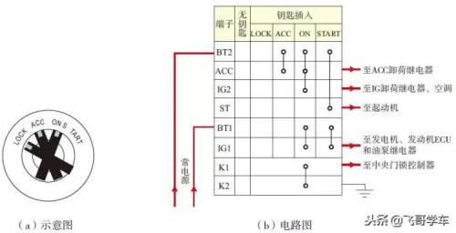 下图所示为长城哈弗四挡位式点火开关示意图及电路图,点火开关的BT1、BT2端子为供电输入,ACC端子输出至ACC卸荷继电器,IG2端子输出至IG卸荷继电器空调,IG1端子输出至发电机、发动机ECU和油泵继电器,ST端子为启动控制,K1端子输出至中央门锁控制器,K2为接地端。