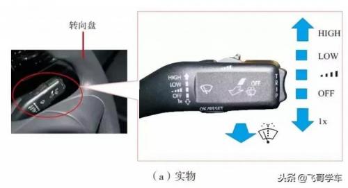 洗涤器是向挡风玻璃上喷水,而刮水器是将挡风玻璃刮拭干净,确保驾驶员有良好的视线。刮水器及洗涤器开关一般安装在转向盘右下方,如下图所示。