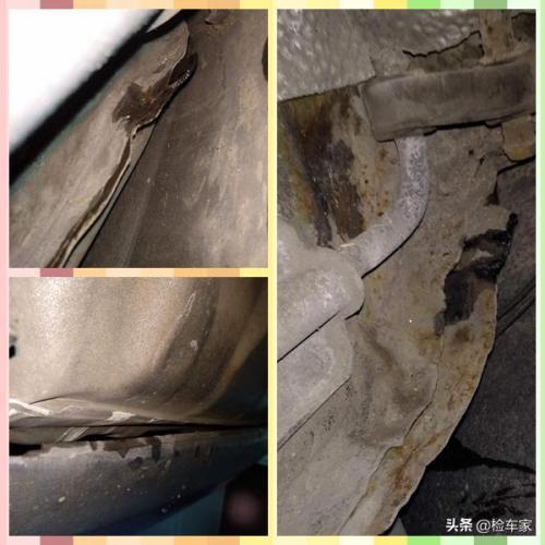 右后叶子板与连接件下部变形,并有水渍渗漏,可以看出未修复到位,未作密封处理。左侧叶子板与连接件变形锈蚀明显,也是未修复到位,未做密封处理。后围板下部及备胎坑变形。
