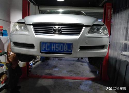 接下来进行上架底盘检测,锐志标准的“花生眼”,还是颗“三连花生”。从这个角度看,两侧大灯的新旧程度也不一样。