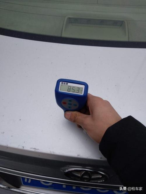 好了,少说话多做事,咱们开始检测。机盖漆面数值并不高,但是也是喷过漆的,等下再看一下里边细节,看是否更换。另外就是机盖有多处比较明显的凹陷。