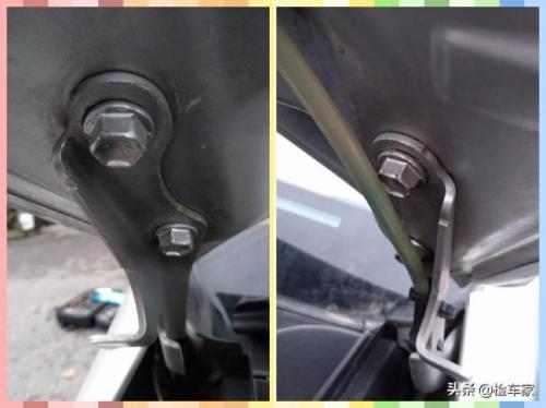 前减震器塔峰固定螺丝无拆卸痕迹,但是由于被一层不知名的物质所覆盖,因此需要擦干净仔细看才能发现。
