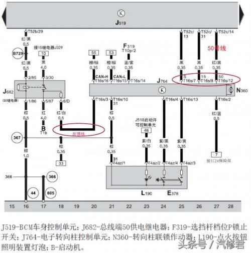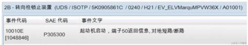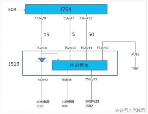 根据上述原理以及车辆能正常启动的情况,可推断故障码P305300(启动机启动端子50返回信息对地短路/断路)的意思是:ELV(J764)作出启动控制,并且收到了BCM通过CAN传来的启动信号,但未通过50R(16s/3)端子收到启动反馈信号。