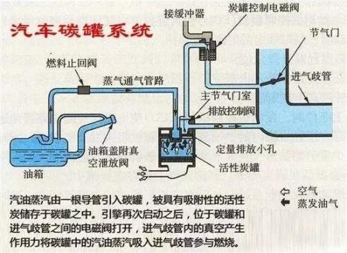 如果我们再来抬抬杠,把油箱完全加满,在加油口都可以看到汽油液面,这种情况下汽油受热膨胀会怎样呢?在这种情况下有一个部件就要遭殃了,那就是碳罐系统。汽车的碳罐系统是用来回收油箱中逸出的汽油蒸汽的,避免逸出到大气中污染空气,在油箱的最高处有一个管路与碳罐相连,汽油蒸汽就从这里进入碳罐。但是如果油箱完全加满了,那么汽油受热膨胀后就会从这个管路进入到碳罐中,对碳罐造成污染,甚至导致碳罐失效,发动机启动困难等故障。