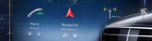 继续往上看,则是目前奔驰车型常见的电话、导航以及收音机三大功能区,这一部分与现款MBUX系统的布局基本一致。