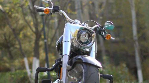 车头大灯位置几乎都是缎面镀铬饰面,乍一看像是长了个“铁头”,仔细看的话缎面镀铬还是很有质感的,摸起来丝丝滑滑。LED的大灯和两个粗壮的前叉融为一体,视觉效果非常夸张,除了哈雷的大巡航之外,肥仔的前脸应该是最“壮实”的。