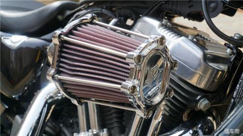 排气改装以后,排气流量增大,X48原装贴在发动机右侧的小空滤进气量自然是不够的,所以特意改装了一套PM空滤,空滤头与连接管为电镀处理,与发动机外形、排气颜色特别搭配,同时探出来的空滤头可以吸入更多空气,提高了发动机工作效率。