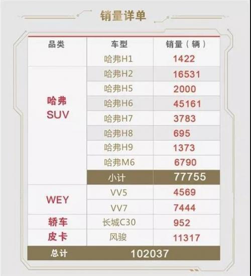 今年9月长城共销售新车102,037辆,较去年同期增长4.46%,10.2万辆,这是长城汽车今年月销量首次突破10万辆——继1月份9.12万辆月销量后再创本年度新高。