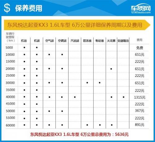 对消费者而言,车辆自购买之日起更多的开销集中在日常的养护及使用成本上。针对2015款东风悦达起亚KX3的日后保养及油耗费用方面,车质网综合目前几大汽车类网站公布的数据进行整理,以供消费者参考: