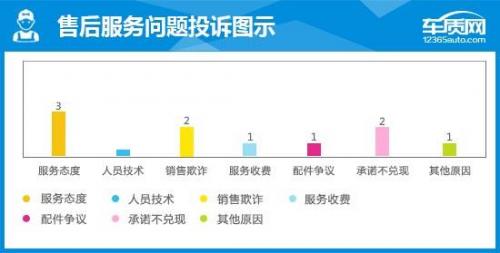 车质网共收到涉及服务类问题的投诉有6宗,涉及10个投诉点,主要问题体现在售后环节中。其中,多位车主表示对服务态度不满意,不过基本属于个别经销商行为,并不具代表性。