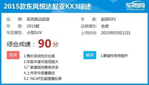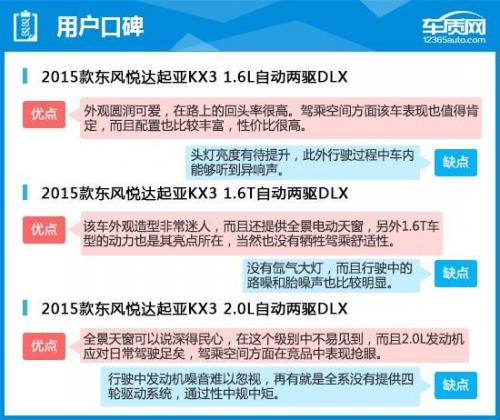 在用户口碑中,消费者对于2015款东风悦达起亚KX3圆润可爱的车身造型大加赞赏,中配以上车型提供的全景电动天窗,更是成为了车主们茶余饭后的谈资,加之车内丰富的便利和舒适性配置,也让消费者颇为欣喜。此外,虽定位小型SUV但其驾乘空间表现不仅能够应对家用,在竞品中更是位列上游。但谈及不足之处,部分车主认为提升车内做工水平,能在一定程度上减少车内异响问题,而全系没有四驱车型,也让向往郊外出游的消费者感到遗憾。
