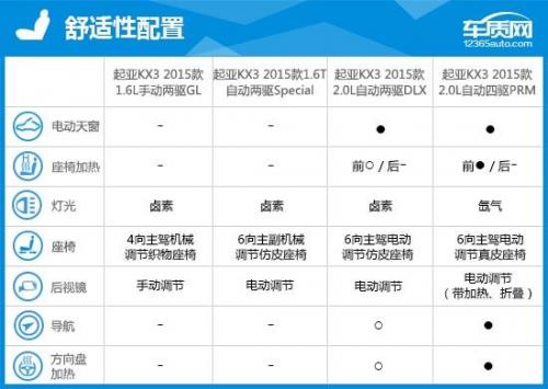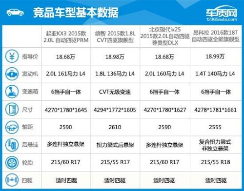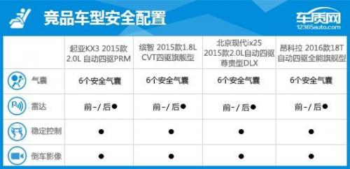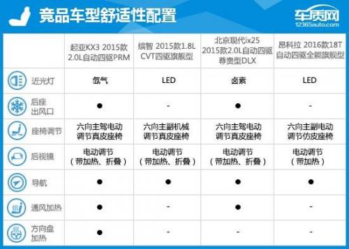 相比竞品车型,2015款东风悦达起亚KX3的优势在于价格、头灯光源和舒适性配置方面。同为顶配车型的前提下,KX3的指导价拥有不小优势,且其近光选用氙气光源,在竞品中也并不多见。不仅如此,该车提供后座空调出风口、方向盘加热、真皮座椅、前排座椅加热及通风功能,对提升驾乘舒适性功不可没。然而相比之下,全系仅顶配提供四驱系统,在面对复杂路况时稍显无奈。