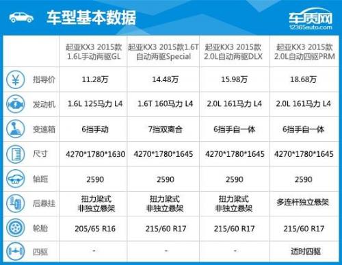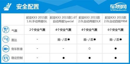 2015款东风悦达起亚KX3的配置颇为实用,诸如行车电脑显示屏、前排中央扶手、单碟CD、电动车窗和遮阳板化妆镜等均为标准配置。而中配车型还带有前雾灯、日间行车灯、后视镜电动调节、前排座椅高低调节、前侧气囊、车身稳定控制系统及陡坡缓降控制功能等,可以进一步提升驾乘便利性、舒适性及安全性。高配车型还提供车内氛围灯、后排空调出风口、定速巡航、倒车影像和自动空调等功能,不仅如此,诸如氙气大灯、座椅通风及加热功能以及头部气帘等,也能在顶配车型中见到,而在增添四驱系统的同时,后悬挂也升级为多连杆独立结构,改善了车辆通过性和驾乘舒适性。总的来说,起亚KX3能够满足不同消费者的用车所需,配置较为全面。
