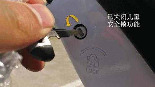 使用机械钥匙插入儿童安全锁开关内,逆时针转动90°便可打开儿童安全锁功能