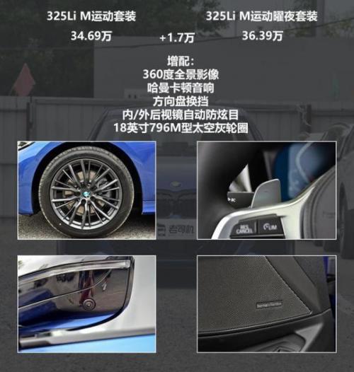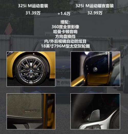 喜欢操控的朋友当然首选短轴版车型,325i M运动套装多花1.6万元即可升级为325i M运动曜夜套装,可谓是颜值与配置双收,其中包含了哈曼卡顿音响、360全景影像、18英寸枪灰色轮圈,换挡拨片等配置。