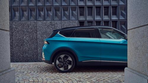 车身侧面,新车采用了双色车身设计,从A柱前缘贯穿到尾灯的俯冲式腰线,强壮有力,干脆利落,极具雕塑气质,让新车充满活力。半封闭的花瓣式轮毂、黑色悬浮式车顶以及贯穿式尾灯等潮流元素,整车看起来十分前卫、时尚。充电口位于前轮眉上方区域,门把手采用了时下流行的隐藏式设计,降低风阻系数和噪音的同时,一体感更强。
