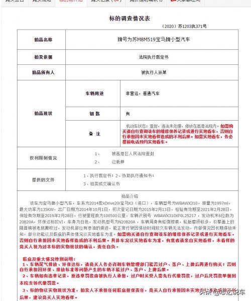 每日一车介绍,今天我们来看一台在5月6日拍卖成功的宝马进口X3,先来了解了解下车库:该车为宝马牌小型汽车,车系为2014款xDrive20i宝马X3(进口),车辆型号为WBAWX310,排量为1997ml,最大功率为135KW,出厂日期为2014年10月1日,初次登记日期为2015年2月13日,检验有效期至2021年2月28日,保险有效期至2019年2月28日,行驶里程数为100500公里,车辆识别号WBAWX310XF0L25217 ,发动机末6位数为20B20A,环保达标欧VI,车身为白色,发动机型号为N20B20A ,车辆周身有轻微擦痕,轮胎磨损较多,引擎盖上的隔音棉被老鼠撕咬过,发动机部位有渗油的痕迹,能正常行驶因停放时间较久车辆无法发动,内部情况因长期停放未知,部分功能以及瑕疵的具体情况以实地看车为准。