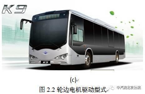 轮边电机驱动型式是将驱动电机安放于副车架上,驱动轮从其对应侧输出轴获取驱动力。轮毂电机驱动型式是将电机和减速机构直接放在轮辋中,取消了半轴、万向节、差速器、变速器等传动部件。轮边电机驱动型式或轮毂电机驱动型式均具有结构紧凑、车身内部空间利用率高、整车重心低、行驶稳定性好等优点。图2.2(a)为一体化轮边驱动系统,由悉尼科技大学与澳大利亚国立科学机构CSIRO共同开发完成,并在三轮太阳能电动车Aurora中得到实际应用,该车通过电机本体和车轮轮辋的一体化设计,最高车速可达72km/h。图2.2(b)为同济大学研制出采用轮边驱动型式的“春晖二号”纯电动车,该电动车的四个车轮通过低速永磁直流无刷轮毂电机直接驱动,并匹配了相应的盘式制动器用于制动。图2.2(c)为比亚迪公司推出的采用轮边电机驱动的纯电动大巴。