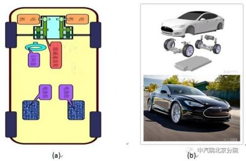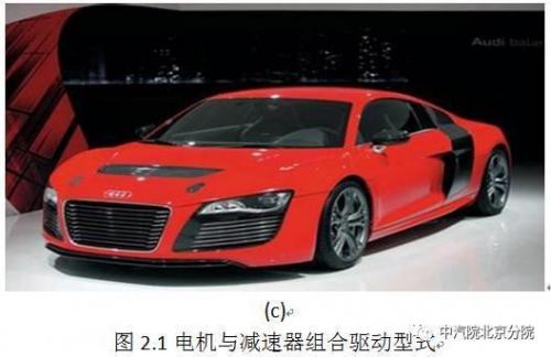 在该驱动型式中,电机与固定速比减速器连接,通过半轴实现对应侧车轮的驱动,由于电机和减速箱布置在车架上,因此在现有车身结构的基础上,稍加改动,该驱动型式即可推广应用。图2.1中的两种电动汽车均采用该驱动型式。其中,图2.1(a)为北京理工大学研发的具有防滑差速功能的双电机分布式驱动车辆结构示意图;图2.1(b)为美国特斯拉公司推出的Tesla Model S型电动汽车及结构示意图。图2.1(c)德国的奥迪R8e-tron纯电动跑车,采用四台异步电动机分布式驱动,百公里加速仅4.8s。