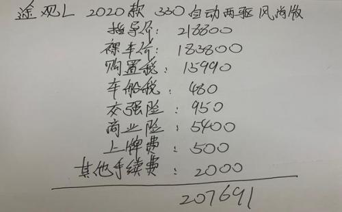 综合近期广州地区车主成交价以及现阶段经销商的优惠,大众途观L 2020款330自动两驱风尚版全款落地价普遍在20万上下,建议多走几家4S店或者选择异地购车,根据不同的报价方案再做决定。