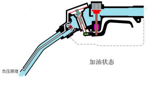 加油油枪的枪口附近有个小孔,当加油时油箱里汽油堵住小孔时,由于快速流动的液体产生负压原理,油枪跳枪。简单的说就是快速流动的汽油会使周围产生一定的负压(汽油快速流动带走附近空气),正常加油时油枪前面的小孔会不断吸进空气,已保持一种平衡,一旦汽车加满油时小孔被堵住在油枪内部真空仓产生负压,直接作用在开关相关部件上,达到关闭油枪的目的(油枪形式不同跳枪的原理也不同)。