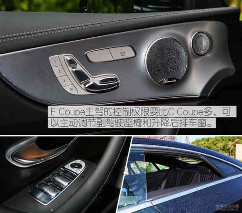 E300 Coupe也是标配有柏林之声的音响,但是没有旋转开启的酷炫效果,而像全景影像、自动泊车这些女性更偏爱使用的配置也都有配备。除此之外,E级Coupe主驾的权限比较高,不仅可以自动调节副驾驶座椅,而且后排的窗户也可以控制开启,这些都是C级Coupe所不具备的。