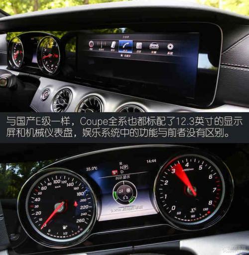 E300 Coupe与E200 Coupe一样都没有采用通体式的全液晶虚拟仪表盘,虽然科技感没有那么强烈,但是该有的功能都有显示,个人觉得机械式的仪表盘看着倒更有亲和力和运动版。12.3英寸的娱乐系统显示屏非常气派,而且色彩度饱满、分辨率很高清,COMAND触摸板也是很灵敏,娱乐系统支持CarPlay等手机互联功能,内饰氛围灯同样拥有64个颜色。