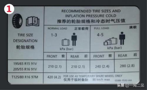 很容易理解,无非就是简单的几组数字。我们说过标签上面所标是冷胎气压,是不是这就是标准,按照这个打气就可以了?肯定不是的。细节下次再讲喔。