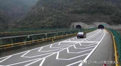 这种地标线你会发现很容易出现在隧道口前,作用是提醒驾驶员在进、出隧道口时,一定要放慢速度。因为隧道内跟隧道外的光线不一样,人们的眼睛并非一下子就能接受光线落差。那么必须慢慢行驶,眼睛也有个适应时间,这样才能防止出现意外。