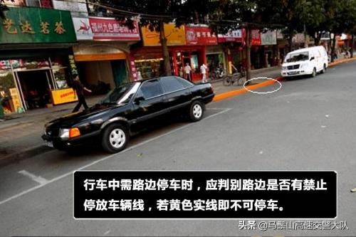 是一条在路肩白色或黄色实线,表示在此路段禁止停车。另外,实线因为常年磨损很可能变成了"虚线",广大车主停车时可得特别注意了,黄白相间的标线表示可以临时,短时间停放车辆,而黄色标线是禁止停放车辆的,无论长短都不可以。本标线可配合"禁止停放"路面文字和禁止停放标志一并使用,并可根据需要在辅助标志上标明禁止路边停放车辆的时间或区间。行车中需路边停车时,应判别路边是否有禁止停放车辆线,若黄色实线即不可停车。