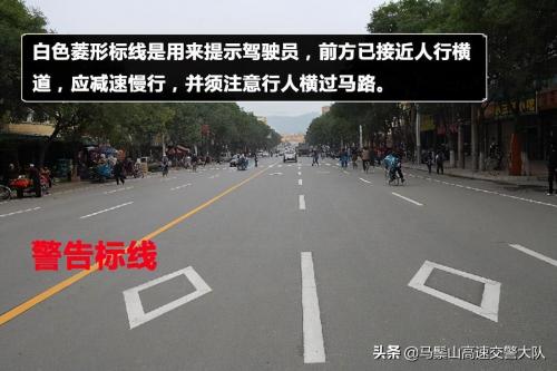 减速提示线通常出现在学校门口或路口等地的路面上,这些提醒车辆减速的标线或标识,样式很丰富,并不单一,在行车过程中需要多留意,看到白色菱形图案,也就是人行横道预告表示,代表着前方已经要接近人行横道了,必须要减速慢行,并要注意横过马路的行人。
