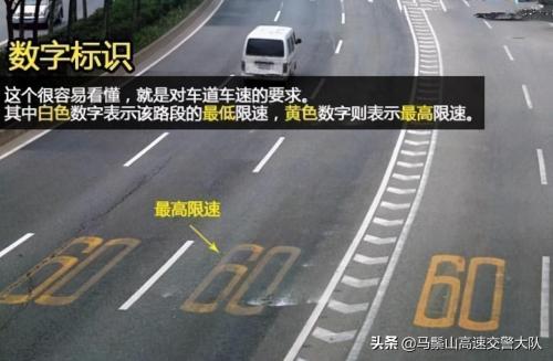 这个也很常见,就是对本车道车速的要求。其中白色的数字表示本车道的最低限速,黄色数字则表示本车道的最高限速。