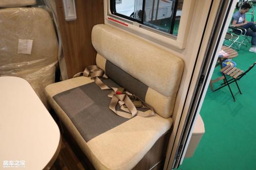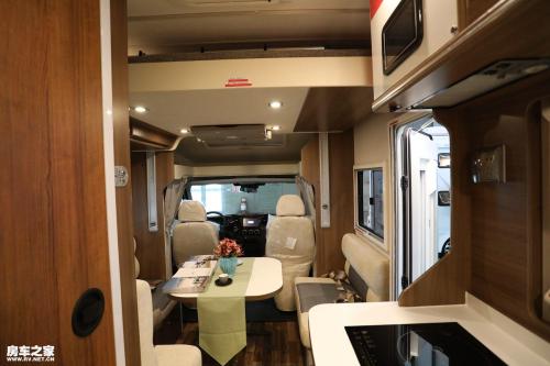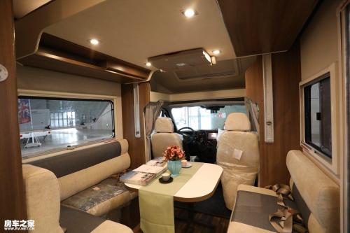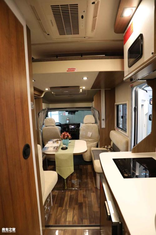 再说说房,内饰整体采用深色风格,前端区域为环形卡座布局;同时正副驾驶座带有旋转功能,方便与乘客进行交流,多人互动氛围也会更轻松。中央的可升降餐桌还可组合成床,顶部还有一张升降的电动床铺,实用性很高,增加睡眠人数的同时提高空间使用率。
