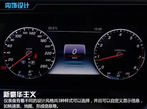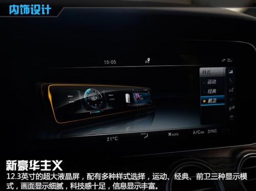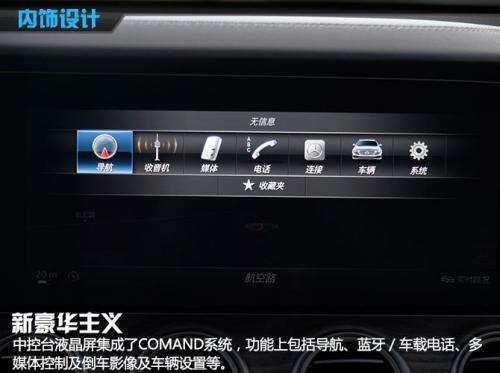 12.3英寸的超大液晶屏,配有多种样式选择,运动、经典、前卫三种显示模式,画面显示细腻,科技感十足,信息显示丰富。中控台液晶屏集成了COMAND系统,功能上包括导航、蓝牙/车载电话、多媒体控制及倒车影像及车辆设置等。