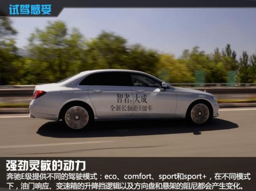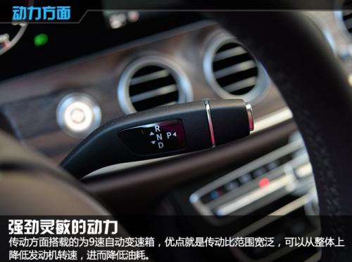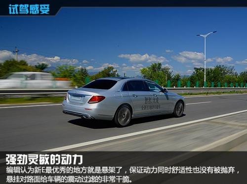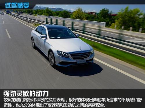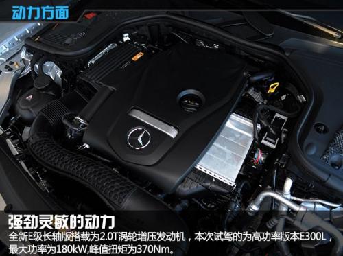 全新E级长轴版搭载为2.0T涡轮增压发动机,本次试驾的为高功率版本E300L,最大功率为180kW,峰值扭矩为370Nm。传动方面搭载的为9速自动变速箱,优点就是传动比范围宽泛,可以从整体上降低发动机转速,进而降低油耗。本次试驾的为高功率版E300L,在试驾过程中并没有因加长而造成动力的不顺畅。实际上动力是非常充盈的。