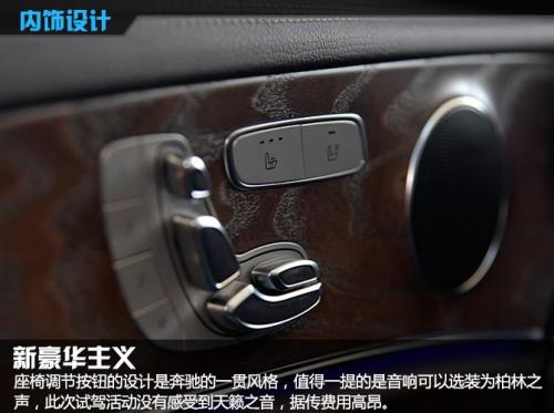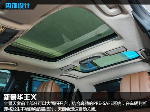 座椅调节按钮的设计是奔驰的一贯风格,值得一提的是音响可以选装为柏林之声,此次试驾活动没有感受到天籁之音,据传费用高昂。全景天窗前半部分可以大面积开启,结合奔驰的PRE-SAFE系统,在车辆判断即将发生不能避免的碰撞时,天窗会迅速自动关闭。
