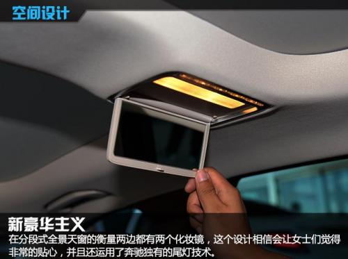位于中央扶手后部的杯架,四周采用镀铬条包围彰显豪华主义,但是空间较浅,有种华而不实的感觉。在分段式全景天窗的衡量两边都有两个化妆镜,这个设计相信会让女士们觉得非常的贴心,并且还运用了奔驰独有的尾灯技术
