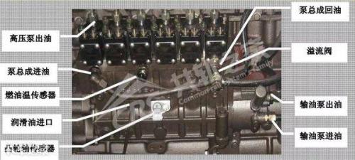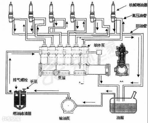 低压油路一般称为燃油系统辅助装置,主要包括输油泵、燃油滤清器和泵箱,保证柴油的滤清、排除油路中的空气和正常足量的低压供油。高压油路主要包括单体泵、高压油管和喷油器,俗称“泵-管-嘴”,系统。