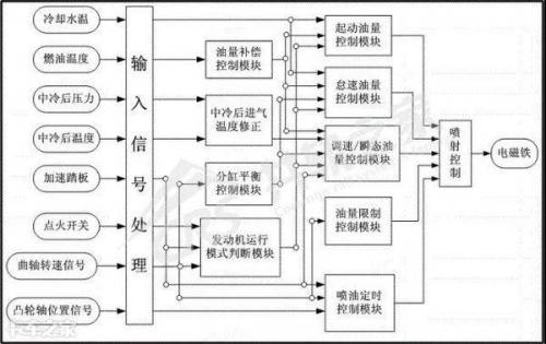 控制逻辑:此控制过程首先是根据曲轴转速信号、油门位置信号和其他几个重要的压力、温度信号来确定发动机运行状态,然后查找相应的MAP图确定喷油量和喷油定时,并输出正确的信号驱动电磁阀,实现喷油量和喷油定时的精确控制。