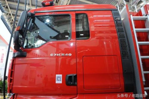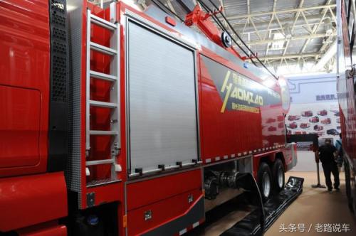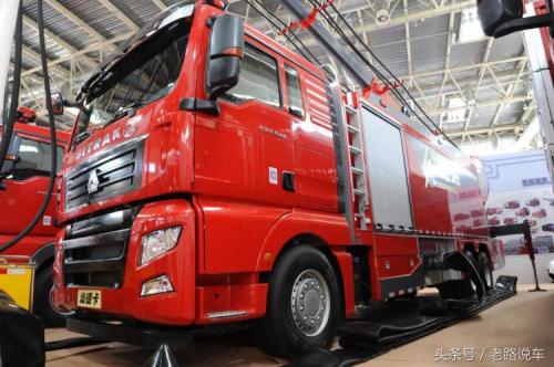在浩淼科技的展台上,中国重汽的卡车搭载着浩淼的上装展现其独特的设计理念。而我们今天要介绍的,就是上图中的中国重汽汕德卡C7H消防车。