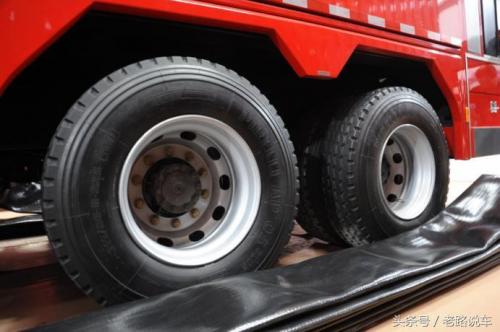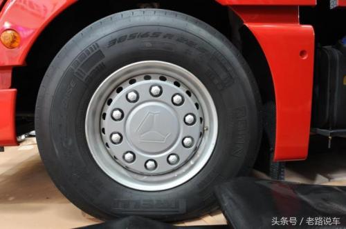 前轮换装了22.5英寸的平口钢圈,钢圈盖和螺栓上都印有中国重汽的徽标,车轮部分欧洲范十足。前桥使用的是倍耐力385/65 R22.5子午胎。后桥部分的轮毂尺寸与前桥相同,但使用的是倍耐力的315/80 R22.5的子午胎。