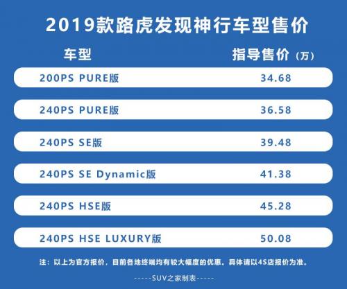 对于那些发现神行的潜在消费者来说,无论是汽车带来的附加值亦或是豪华、科技感的配置或许不会是他们的刚需。而那套全地形反馈适应系统和四驱系统带来的对更复杂路况的适应能力和更好的循迹表现才是他们真正对于2019款发现神行的需求。那么对于已经具备基本舒适性和安全配置的PURE版车型无疑是最好的选择,同时34.68万的入门指导售价目前还有不错的终端优惠。若你仅基于路虎越野性能而言,购买高功率240马力PURE版的车型或许最为合适,满载情况下的极限动力和脱困时的低扭表现会更加畅快淋漓;当然,不排除有许多消费者既想满足强劲的动力,又想获得更多的豪华科技性配置体验,那么这时你所能选择的车型已经来到HSE版本(其中购买HSE LUXURY版车型的人绝对是路虎的忠实粉丝。),45.28万的售价估计够你犹豫一段时间,因为40-50万级别的车型中,可选的车型太多,无论是身处一线阵营中的BBA,还是位列二线豪华战队中的雷克萨斯、凯迪拉克等车型都已具备你所想要的需求;那么如果你想追求品牌所带来身份附加值,或是在自驾中有更大的越野需求,路虎发现神行值得考虑。说了这么多,大家对于2019款路虎发现神行全系车型的价构还有什么看法呢?不妨在评论区留言。