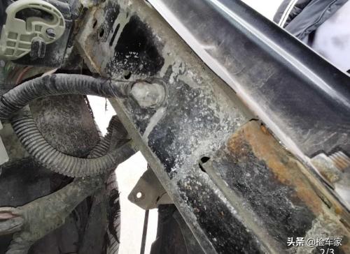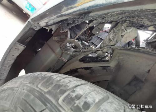 从蹲姿变为站姿,再看看通透的左前翼子板骨架内侧,明显是后期烧焊修复过的,看来左前方的事故是没跑了。