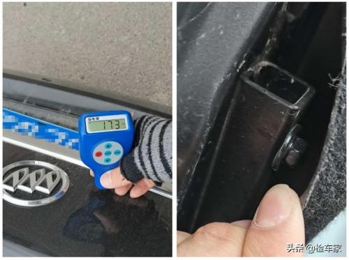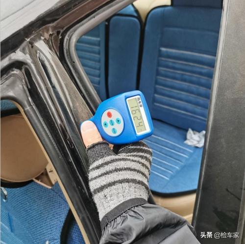 再看B柱,也是钣金修复过的,通过目前的检测,车辆左前和左侧都是发生过不小的事故。