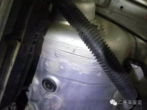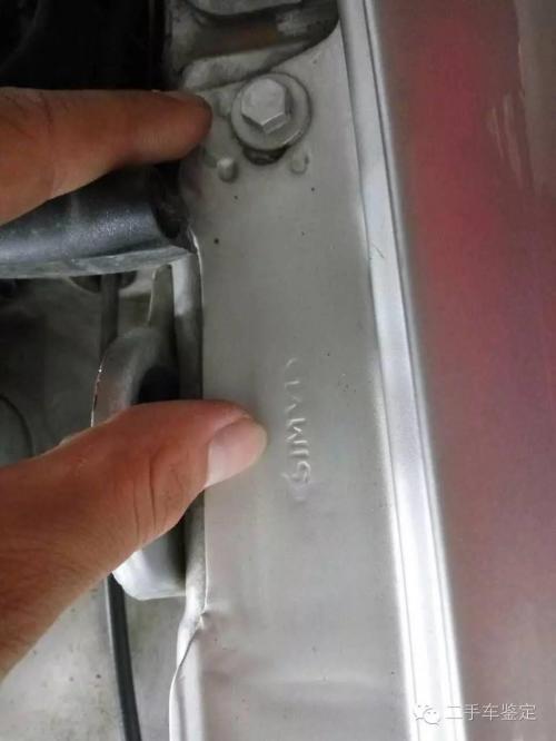 减震器座这个位置的钣金胶本身打的就非常不规律,但你可以明显看出左侧打的钣金胶有起泡和重新喷漆的痕迹,最最最明显的就是焊点,原厂的焊点非常规整,而且表面非常干净,后打的焊点不规整,而且表面明显的麻点,做工明显有区别;